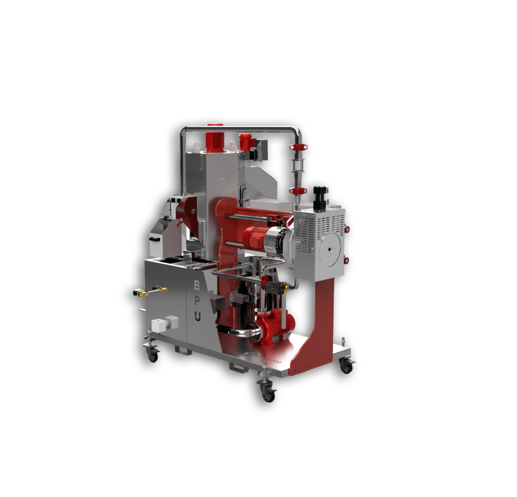 BPU2は、ペレタイジングユニット、ダイおよびカッティング機構、循環水、遠心乾燥機、電気制御システムなどを一体化したコンパクトなフレーム構成を採用しています。溶融樹脂はダイから押し出され、回転刃によって水中でカットされることで瞬時に冷却・固化され、その後遠心乾燥機によって水分が除去されます。これらすべてのユニットは可動式フレーム上に統合されており、ラボ環境でも設置・移動が容易な設計となっています。